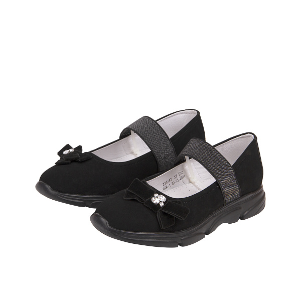 Мягкие и легкие туфельки для девочек изготовлены из замши с декоративными элементами. Цельнолитая подошва из ЭВА имеет утолщение в зоне пятки и закрывает носок каждой туфельки, чтобы продлить срок службы обуви и делать ее комфортнее. Объемный бархатный бант с прозрачными стразами украшает туфли. А в качестве фиксатора обуви на ногах используются широкие эластичные резинки черного цвета с серебряными нитями люрекса. Благодаря резинкам ребенок сможет быстро обуться самостоятельно и не бояться потерять туфли во время активности. Подкладка и стелька выполнены из натуральной кожи. Верх обуви пошит из искусственной кожи.