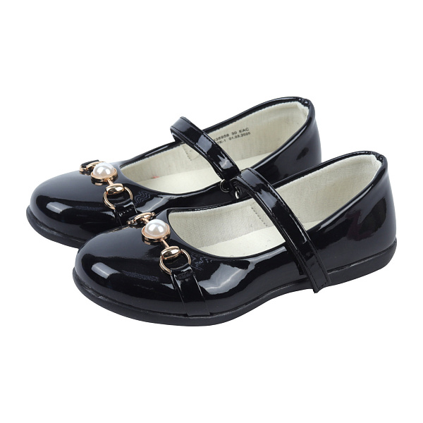 Туфли для девочки имеют черный цвет и лаковое покрытие. Внешний вид отличается блеском и гладкостью поверхности. На передней части туфель расположена жемчужина и металлические кольца как украшения. Застежка выполнена в виде ремешка с липучкой. Это позволяет легко надевать и снимать обувь. Форма туфель простая, без каблука
