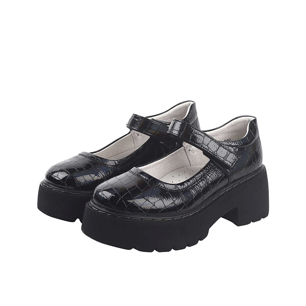 Туфли для школьниц выполняют оба условия. Классический черный цвет, невысокий каблук, фиксированный носок и задник – все это полностью подходит под требования любой школы. А материал верха, имитирующий крокодиловую кожу, толстая платформа и застежки-липучки придают стандартной обуви оригинальность и особый стиль.