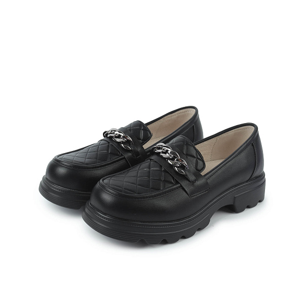 Туфли для девочек представлены в классическом черном цвете, идеально подходящем для школьной формы. Мягкий стеганный узор на передней части добавляет изысканности, в то время как украшение в виде цепочки на ремешке приносит современный акцент. Подошва с рифлением обеспечивает хорошее сцепление с поверхностью, что важно для безопасности в школе и на игровой площадке.