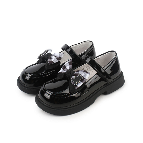 Туфли для девочки выполнены в стильном черном цвете с глянцевой верхней частью из искусственной кожи. Модель украшена крупным бантом в черно-белую клетку и декоративной фигуркой мишки с стразами. Легкая застежка на липучке позволяет быстро и удобно зафиксировать обувь на ноге.
