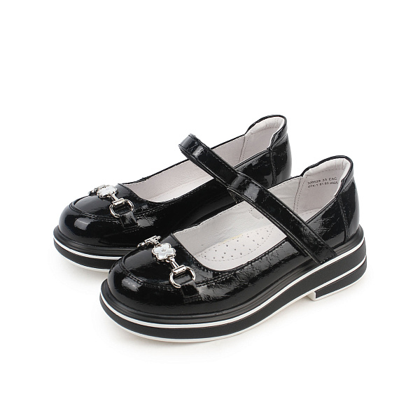 Туфли для девочки выполнены из черной искусственной кожи с глянцевым блеском, что придает им аккуратный и нарядный вид. Модель украшена элегантной металлической деталью в виде цветка на носке и удобным ремешком на липучке, который обеспечивает надежную фиксацию. Благодаря такой липучке ребенок может снять и надеть туфли самостоятельно.