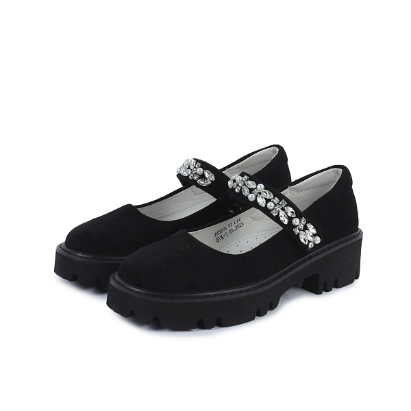 Черные туфли на липучках, украшенные блестящими бусинками и камушками, создают нарядный образ, который идеально подойдет для повседневной школьной жизни.