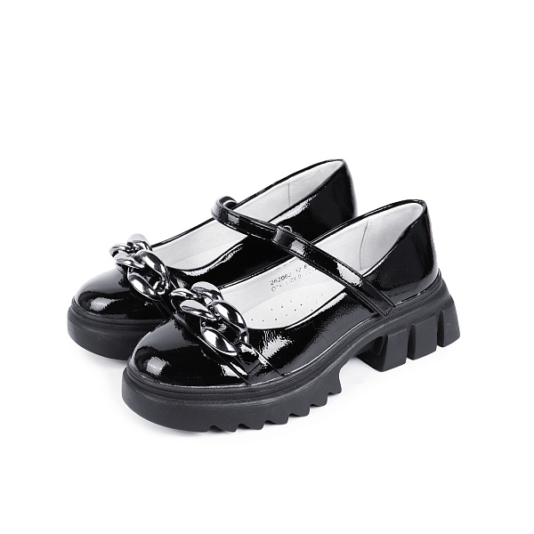 Лаконичные черные туфли для школы точно понравятся каждой любительнице моды. Модель застегивается на застежку-липучку сбоку, это позволит юной школьнице самостоятельно обуться без помощи взрослых. Туфли изготовлены из прочной кожи. Модель красиво блестит и переливается на солнце благодаря лаковому покрытию, блеск которого подчеркнут массивной металлической цепью черного цвета на носке изделия. Прорезиненная подошва из нескользящего ТПР имеет небольшой каблук для комфортной ходьбы или бега. Такая подошва равномерно распределяет нагрузку на ноги. Стелька и подкладка выполнены из натуральной кожи.