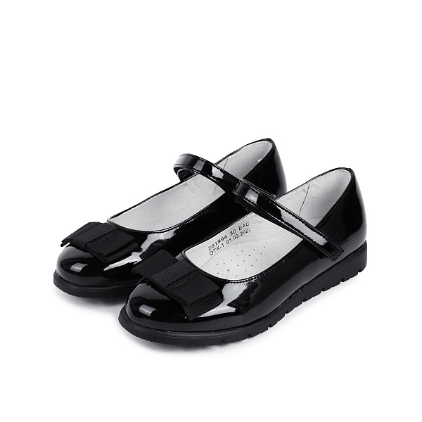 Под любой стандарт школьной одежды в школе подойдут черные школьные туфли. Они изготовлены из кожи с лакированным верхом. Подошва мягкая, без выраженного каблука изготовлена из нескользящего ТПР. На носке черный крупный бант. В таких туфлях ноге удобно и комфортно, ведь подкладка и стелька выполнены из натуральной кожи. Такой материал хорошо пропускает воздух и впитывает влагу. Обувь стильная, модная, в то же время полностью вписывается в дресс-код учебных заведений. Рекомендовано для детей школьного возраста.