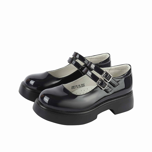 Эффектные лаковые туфли органично впишутся в гардероб девочки школьного возраста. Они привлекают внимание двойными ремешками с металлическими пряжками. Обувь можно применить в качестве уличной или сменной, она гармонично сочетается с любыми юбками, сарафанами или брюками.
