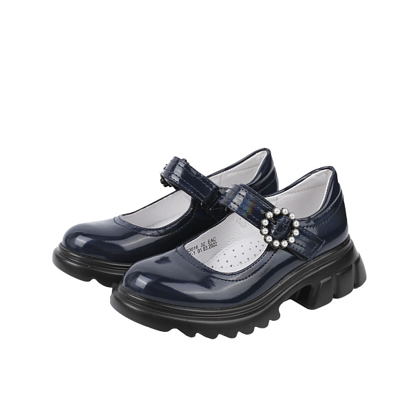 Лаконичные туфли должны быть в гардеробе каждой школьницы. Данную модель обуви можно назвать классической и сдержанной. Она пошита из лаковой кожи, имеет минимум декоративных элементов. Фиксируется на ноге с помощью прочной застежки на липучке, декорированной металлическим украшением с маленькими кристаллами. Благодаря закрытому заднику и супинатору на стельке, а также массивной утолщенной подошве, отлитой из полиуретана, модель хорошо сидит на ноге, не натирая нежную кожу ребенка и равномерно распределяя нагрузку нак стопы. Рекомендовано для детей школьного возраста.