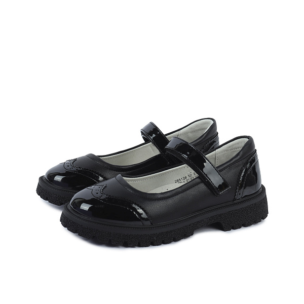 Черные туфли на липучке с глянцевыми вставками на носке и пятке создают элегантный и стильный образ, который станет прекрасным дополнением к школьным нарядам, подчеркивая безупречный вкус юной модницы.