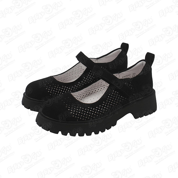 Школьные туфли для девочки выполнены из искусственной кожи с выразительной сетчатой текстурой — маленькими аккуратными отверстиями по всему верху. Такая структура обеспечивает хорошую вентиляцию, позволяя ногам сохранять комфорт и свежесть даже в течение долгого учебного дня. Черный цвет легко сочетается с любыми школьными нарядами, создавая строгий и аккуратный образ. Ремешок на липучке надёжно фиксирует стопу, не стесняет движений и делает обувь удобной в носке.