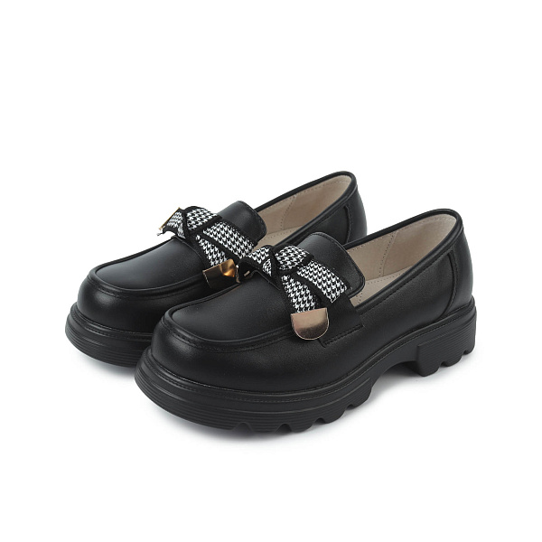 Школьные туфли для девочек совмещают в себе традиции и модные тенденции. Черная искусственная кожа, из которой сделан верх обуви, подчеркивает формальный стиль и облегчает чистку. Оригинальный декоративный ремешок с принтом «гусиная лапка» и элегантным металлическим элементом добавляет изюминку.