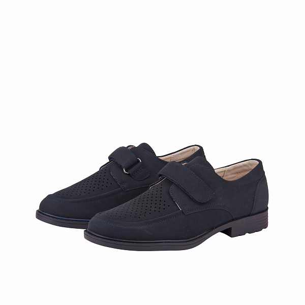 Эффектные темно-синие замшевые туфли для мальчика составят чудесный ансамбль с предметами школьной формы и парадным костюмом. Изящный удлиненный и скругленный носок делает ногу аккуратной и не сдавливает ее по бокам. Передняя часть имеет вставку с мелкой перфорацией, чтобы обеспечить полноценную вентиляцию ног в течение дня.