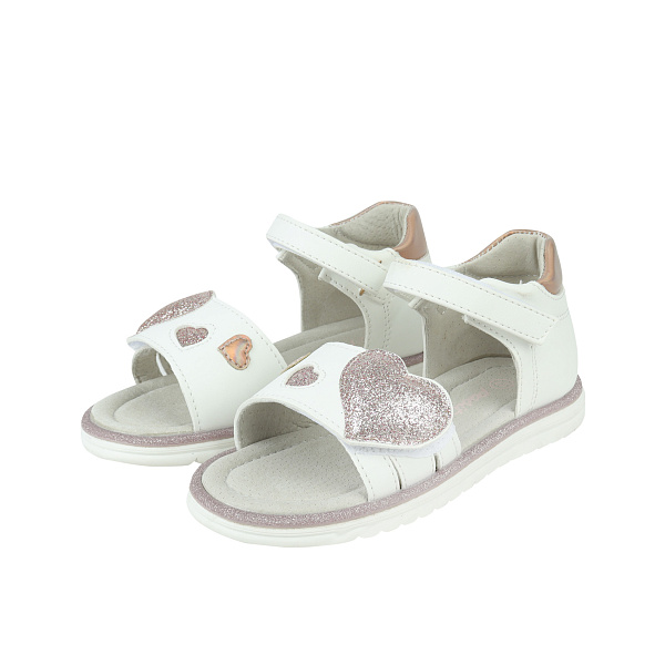 С открытыми светлыми сандалиями прогулки в теплую погоду станут еще комфортнее. Открытый носок обеспечит вентиляцию стоп, а закрытый задник зафиксирует стопу и не даст ей съезжать. Верх обуви изготовлен из искусственной кожи, а подкладка и стелька – из натуральной. Белая подошва из термопластичной резины (ТПР) препятствует скольжению и не оставляет черных полос на полу. В качестве застежки использована липучка – с ее помощью ребенок научится обуваться самостоятельно. Украшает обувь блестящие розовые сердечки.