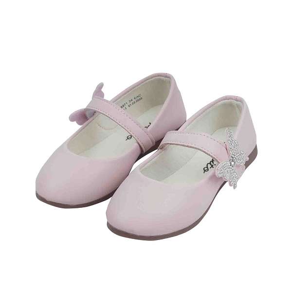 Туфли для девочки выполнены из мягкого материала светло-розового цвета, создающего нежный и привлекательный образ. Модель имеет удобную застежку на ремешок, который дополнен декоративной бабочкой, украшенной стразами, придающей обуви изысканность и стильный акцент.