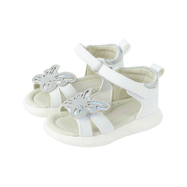Очаровательные открытые летние туфли для девочек в белом цвете. Основной материал гладкий и матовый. У обуви есть дополнительные декоративные блестящие вставки в районе пяток, а на мысках расположилась серебристые бабочки. У изделия две застежки на липучках, с которыми справиться даже совсем маленький ребенок. Закрытая пятка поддерживает свод стопы и помогает распределять нагрузку. Их можно носить летом в жаркую погоду или как сменную обувь в детский сад.