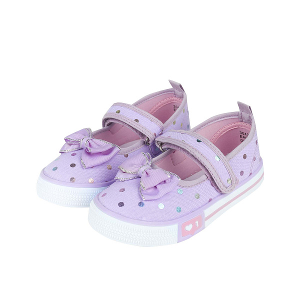 Цветовое оформление туфель – сочетание сиреневого верха и белой подошвы. На носке зафиксирован большой красивый бант, а все поле верха декорировано блестящими горошинами.