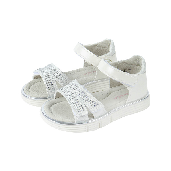 Удобные и стильные открытые летние туфли для девочек дошкольного возраста. Они выполнены в белом цвете с мерцающим перламутровым покрытием. Мысок украшают серебристые стразы. Застегиваются на липучки, что значительно упрощает процесс переобувания. Модель с закрытой пяткой, помогающей поддерживать стопу в правильном положении. Носить можно летом на прогулках или круглый год как сменную обувь в детский сад.