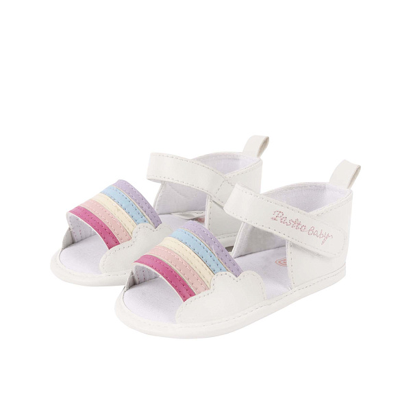 Аккуратные летние туфли органично впишутся в гардероб девочки ясельного возраста. При создании модели дизайнер использовал все цвета радужного спектра и очертания облаков, учел особенности детской анатомии. Внешнее оформление изделия заинтересует ребенка, поднимет настроение всем членам семьи. Ремешок с липучкой предельно упростит процесс переобувания.