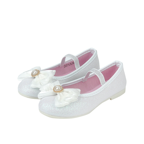 Эти изысканные ясельные туфли для девочек стали воплощением утонченности и детской невинности. Выполненные в нежном белом цвете с перламутровым блеском, они привлекают внимание мерцающим покрытием, которое создает сказочный эффект. На носках туфель расположены большие шёлковые банты с декоративной жемчужиной в центре, окруженной золотистыми элементами, что придает обуви праздничный, нарядный вид.