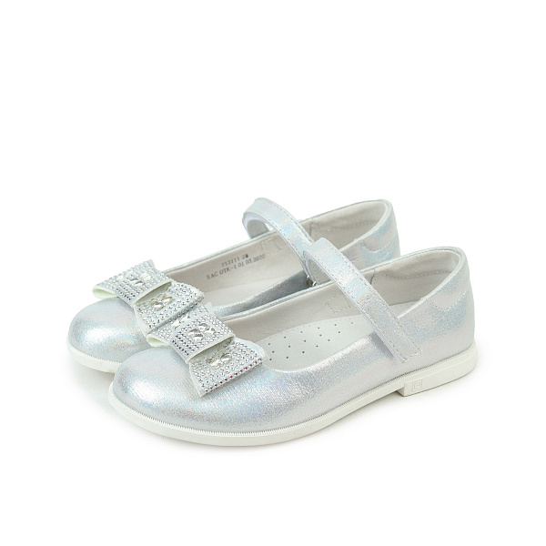 Элегантные туфли серебристого цвета понравятся девочке дошкольного возраста. Они органично впишутся в гардероб маленькой модницы, дополнят нарядные платья и школьную форму. Модель украшена бантом, покрытым сверкающими стразами. Обувь имеет удобный ремешок с липучкой. С его помощью обувь плотно фиксируется на ноге.