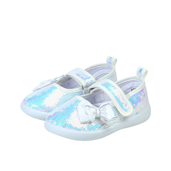 Яркие туфли порадуют ребенка красочным оригинальным дизайном. Верх пошит из текстиля и украшен сверкающими голографическими пайетками, создавая необычный эффект. В качестве застежки использована липучка, она плотно фиксирует обувь на ноге и облегчает обувание. Носок обуви круглый, украшен белым бантом. Подкладка и стелька из хлопчатобумажного материала отлично впитывают влагу, пропускают воздух и обеспечивают ногам комфорт в носке. Белая подошва изготовлена из ПВХ, материал не утяжеляет обувь и устойчива к истиранию.