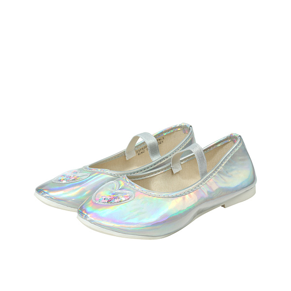 Оригинальные туфли с голографическим эффектом покорят сердце каждой девчонки. Серебристый верх изготовлен из искусственной кожи, носок овальный и дополнен объемным сердцем с блестящими звездочками внутри. Текстильные стелька с подкладкой хорошо пропускают воздух и впитывают влагу, обеспечивая комфорт ногам. Белая рельефная подошва из ТПР препятствует скольжению, не оставляет черных полос на теле и равномерно распределяет нагрузку за счет упругости. В качестве застежки использована тонкая резинка. Такие туфли чудесно подойдут под праздничные наряды и сменную обувь.