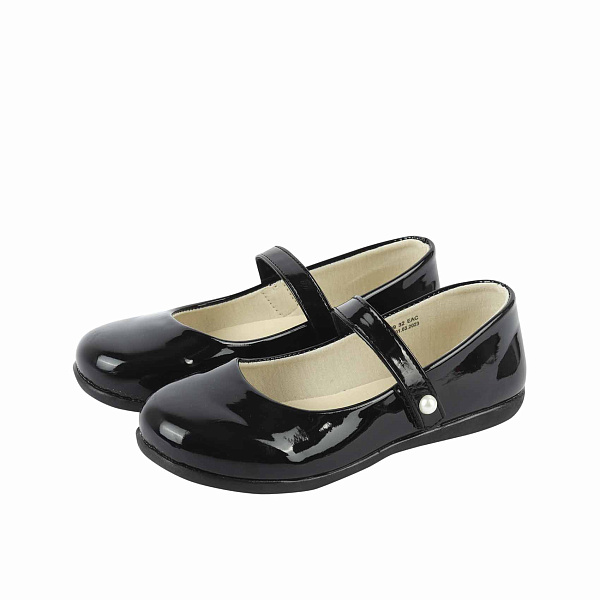 Удобные туфли для школьницы привлекают внимание лаконичным дизайном. Они снабжены фиксирующим ремешком, на котором закреплена жемчужинка. Модель органично дополнит школьную форму, успешно справится с функцией уличной или сменной обуви.