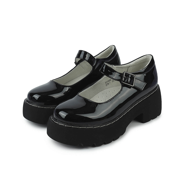 Эти стильные черные туфли для школьниц — отличное сочетание элегантности и удобства. Верх туфель выполнен из лакового материала, который придает им блестящий, глянцевый вид и делает изюминкой гардероба. Туфли украшены ремешком с классической пряжкой, который не только добавляет стильный акцент, но и обеспечивает надежную фиксацию на ноге.
