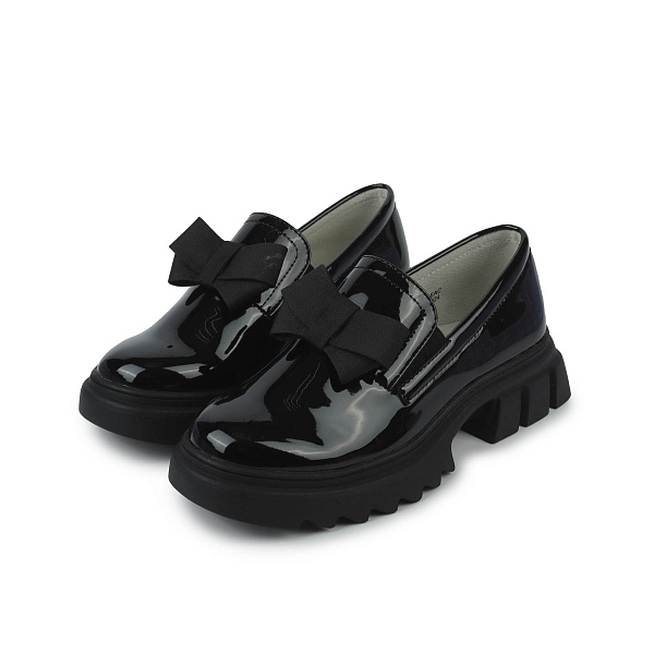 Эти элегантные черные школьные туфли для девочек объединяют в себе практичность и модный дизайн. Выполненные из лакированного материала, они обладают глянцевой поверхностью. Центральным элементом дизайна является аккуратный черный бант, расположенный на верхней части туфель, добавляющий нотку игривости и изысканности.