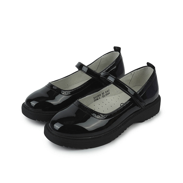 Туфли выполнены из искусственной кожи, что обеспечивает прочность и простоту в уходе. Лаковое черное покрытие создает универсальный дизайн, который легко сочетается с любыми нарядами и очищается от пыли и грязи. Стелька и подкладка изготовлены из светлой натуральной кожи, которая дарит комфорт, не нарушает обмен воздуха и не окрашивает носки и колготки.