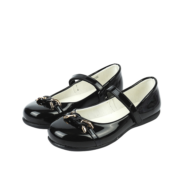 Элегантные туфли станут отличным дополнением к праздничному образу девочки. Украшает мысок крупная цепочка с золотистыми деталями. Лаковое черное покрытие придает обуви блеска.
