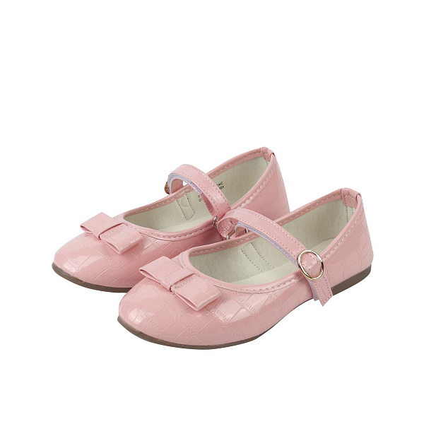 Розовые туфли с минималистичным элегантным дизайном украсят праздничный наряд маленькой модницы. Лаковое покрытие придает паре дополнительный блеск, а бант на мыске и золотистая пряжка на застежке становятся деталями, которые привлекают внимание.