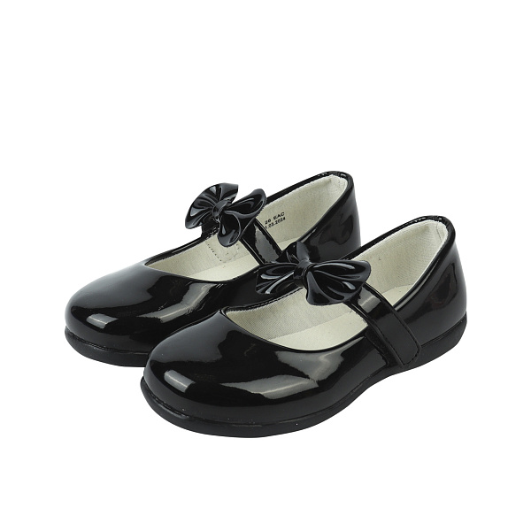 Эти элегантные туфли с закругленным мыском украсят праздничный образ маленькой модницы, не стесняя движений. Лаковое черное покрытие создает универсальный дизайн, который легко сочетается с любыми нарядами. Милым акцентом выступают лакированные банты на застежке.