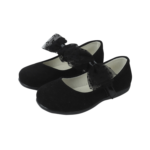 Эти туфли для девочек сочетают изысканность и комфорт, создавая идеальный вариант для торжественных мероприятий и повседневных образов. Выполненные из бархатистого черного материала, они обладают матовой поверхностью, которая выглядит роскошно и элегантно. Украшенные ремешком с объемным бантом из сетчатого материала в горошек, туфли приобретают утонченный и праздничный вид, создавая яркий акцент на образе.