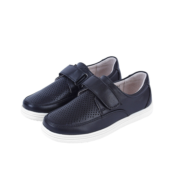 Если не хотите, чтобы ваш шустрый мальчуган оставлял черные полосы на полу в коридорах школы, можете отдать предпочтение полуспортивным туфлям с белой подошвой из термопластичной резины. Такая подошва будет мягко пружинить при ходьбе, создавая комфорт для стопы. Туфли скопировали стиль мужских мокасин для парусного спорта, за исключением шнуровки, которую заменили на липучки – с ними легче и быстрее можно застегнуть обувь. Туфли изготовлены из искусственной матовой кожи с перфорацией. Подкладка и стелька сшиты из натуральной кожи, обеспечивая вентиляцию стопы, защиту от микробов и бактерий.