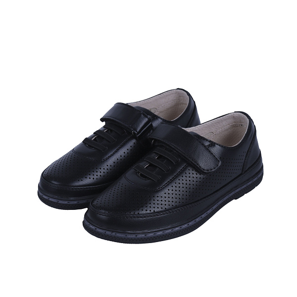 Классические школьные туфли изготовлены из матовой кожи черного цвета с декоративной строчкой. Благодаря перфорации по всему изделию обеспечена естественная вентиляция воздуха. Фиксация на ноге осуществляется посредством застежки на липучей основе, поэтому ребенок сможет быстро надеть и снять обувь при переодевании. Стелька изготовлена из натуральной кожи, она имеет небольшую мягкую подушечку, а подкладка выполнена из комбинации натуральной кожи и текстиля. Подошва изготовлена из ТПР с повышенной стойкостью к износу. Данная модель туфель станет отличным дополнением школьного или повседневного образа ребенка.