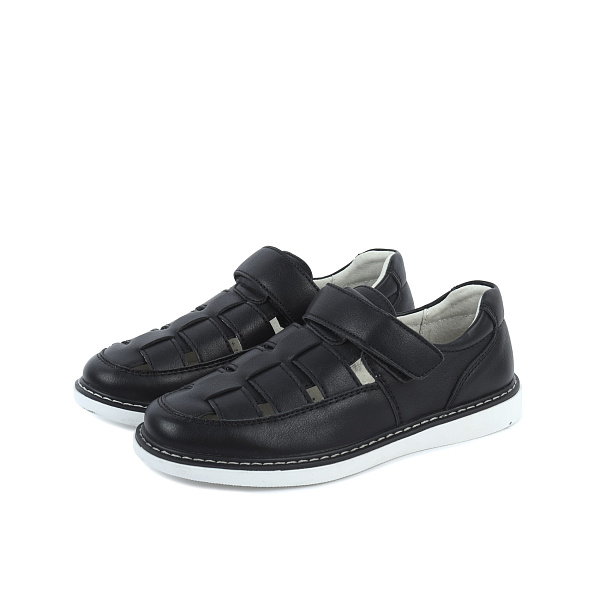 Черные туфли на липучке с перфорацией и белой строчкой вокруг подошвы гарантируют выразительный образ и безупречный стиль юного обладателя ботинок. Верх выполнен из искусственной кожи, надежная подошва из термопластичной резины. Стелька с подкладками из натуральной кожи создаёт необходимый уровень комфорта.