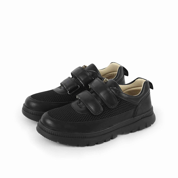 Мальчику школьного возраста придутся по душе оригинальные туфли. Модель оснащена широким язычком и парой ремешков с липучками. Они надежно фиксируют обувь, позволяют скорректировать посадку по ноге. Удобный задник гарантирует правильную постановку стопы. Его мягкий верхний край не натирает пятку.