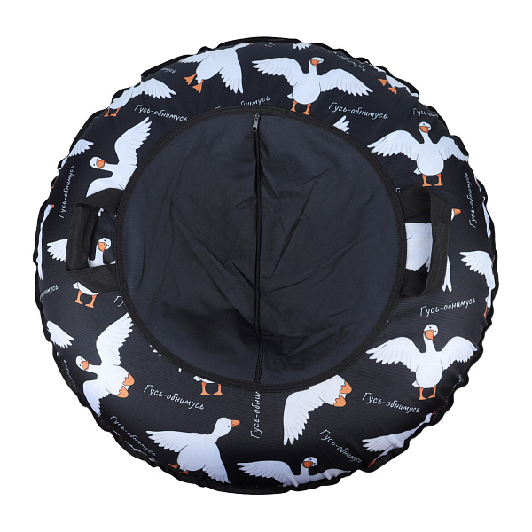 Тюбинг Rollo Pro «Гусь-обнимусь» с ручками предназначен для зимних развлечений детей старше 5 лет. Диаметр тюбинга составляет 100 см. Изделие выдерживает максимальную нагрузку до 110 кг. Яркий дизайн с изображением веселых гусей делает катание веселым и запоминающимся.