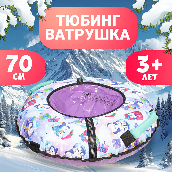 Тюбинг с пингвинами – это надежный и яркий аксессуар для зимних развлечений. Материал покрытия изготовлен из прочной ткани, украшенной принтом с изображением пингвинов. Внутренний диаметр круга составляет 70 см, что делает его подходящим для детей и подростков.