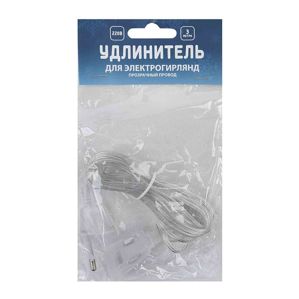 Удлинитель прозрачный с длиной провода 3 метра предназначен для быстрого и удобного подключения электрогирлянд к розетке. Корпус и провод выполнены из прозрачного пластика, что придает изделию аккуратный и минималистичный вид, позволяя гармонично вписаться в любое оформление. Конструкция рассчитана на напряжение 220В и обеспечивает надежное соединение приборов без потери качества электропитания. Удлинитель подходит для использования как в быту, так и в праздничных украшениях.