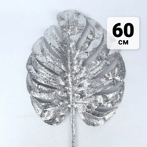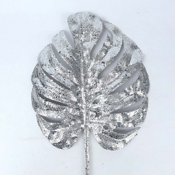 Украшение декоративное Лист монстеры с глиттером серебристый 60см