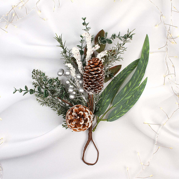 - Композиция из искусственных хвойных веток, шишек, серебристых ягод.
