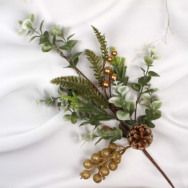 Украшение декоративное Ветка хвойная с шишками и золотистыми ягодами 50см