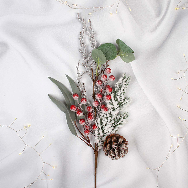 Новогодняя ветка длиной 50 см украшена имитацией снега, красными ягодами и шишкой. Ветка состоит из хвойных иголок, красных ягод и еловой шишки с легким снежным покрытием. Такой аксессуар подходит для праздничного оформления интерьеров и создания зимней атмосферы.