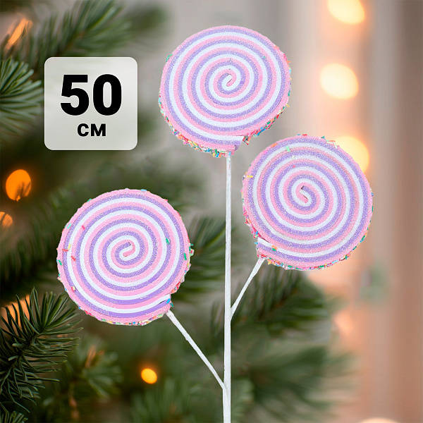 Ветка выполнена из пластика и представляет собой декоративный элемент высотой 50 см в виде 3 сиреневых леденцов в нежных пастельных тонах. Леденцы оформлены в виде спирали с блестящей поверхностью и украшены разноцветными деталями по краям, создавая эффект сладкого и яркого декора. Такая ветка отлично подойдет для оформления праздничных композиций, интерьеров или тематических фотозон.