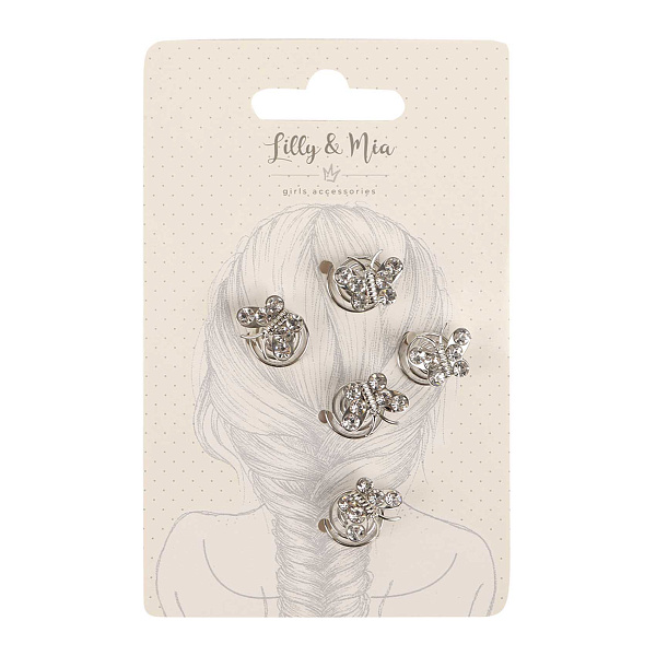 Элегантное украшение для волос выполнено в виде спиральки с серебристыми бабочками. На крыльях металлических бабочек расположены блестящие стразы. Аксессуары станут необычным вариантом декора прически для выпускного или первого звонка. Набор из 5 штук позволяет составить самые разные композиции. Серебристая спиралька надежно фиксирует украшение, прячась под волосами, на поверхности остаются сияющие на солнце бабочки.