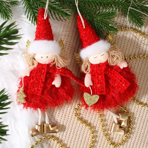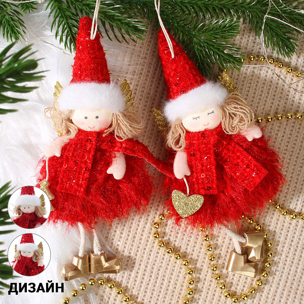Декоративное украшение в виде ангела выполнено из текстильных и декоративных материалов, высотой 18 см. Ангел одет в яркое красное платье из пушистого материала с блестящими пайетками, дополненное шарфом. На голове — красная высокая шапка с белой меховой отделкой, придающая образу праздничное настроение. Изящные золотистые крылья с текстурой и блестящим эффектом создают атмосферу сказочности и волшебства. В руках ангела — небольшой декоративный аксессуар в форме блестящей золотистой елочки. Фигурка прекрасно подходит для украшения новогодней елки или праздничного интерьера.
