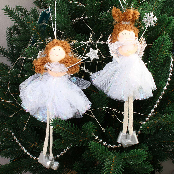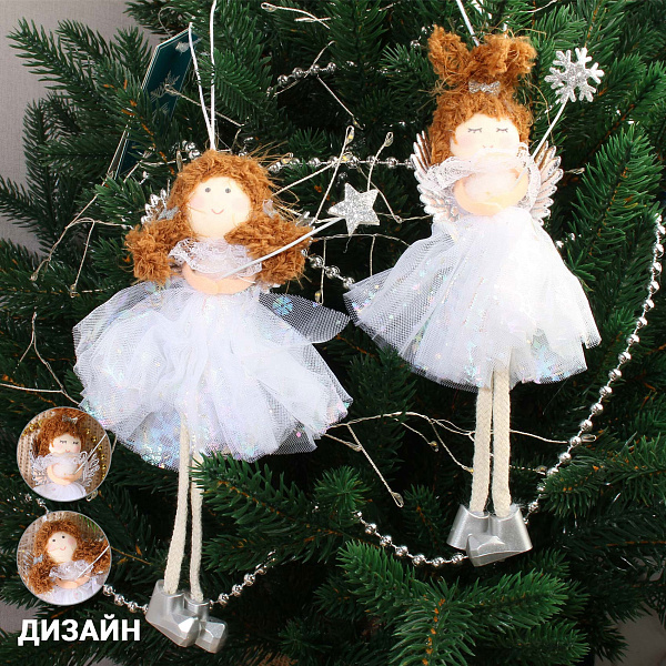 Украшение в виде ангела выполнено из текстиля и декоративных материалов, представляя собой легкую и воздушную фигурку высотой 19 см. Ангел одет в белоснежное платье из нежной ткани с сияющими переливами и украшен серебристыми крыльями с рельефной текстурой. Волосы сделаны из мягкого ворсистого материала коричневого цвета, уложены в аккуратную прическу и дополнены маленькими бантиками. В руках ангела — изящный посох, что придает образу завершенность и праздничное настроение. Изделие идеально подходит для украшения новогодней елки или праздничного интерьера, добавляя очарование и атмосферу волшебства.