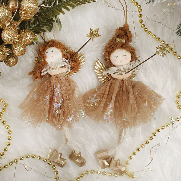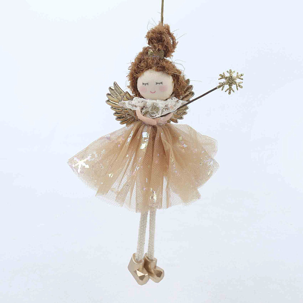 Украшение в виде ангела в коричневом текстильном исполнении высотой 18 см. Ангел одет в воздушное платье из блестящего тюля золотистого оттенка и держит в руках волшебную палочку с золотистой звездочкой на конце. У фигурки мягкое, нежное личико, а волосы сделаны из коричневой пряжи. Украшение оснащено петелькой для подвешивания на ель или другой предмет для декорирования.