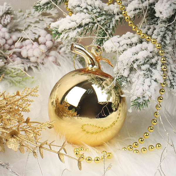 Елочное украшение в виде апельсина выполнено из стекла с глянцевым золотистым покрытием в стиле лофт. Диаметр изделия составляет 8 см, что делает его компактным и выразительным элементом праздничного декора. Украшение имеет оригинальную форму с выступающей хвостовой частью и петлей для подвешивания на елку или в новогодние композиции. Глянцевая поверхность придает изделию современный и элегантный вид.